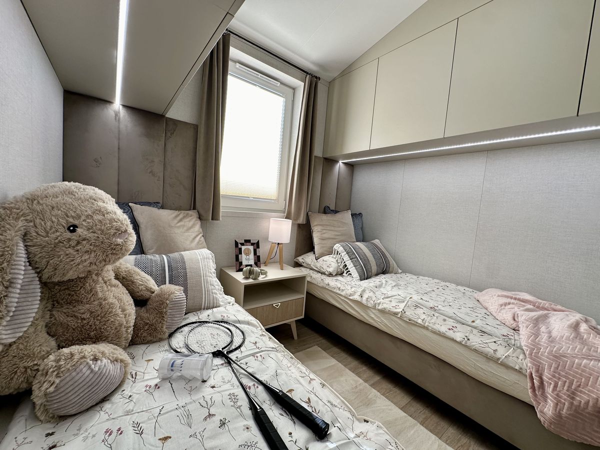 Una cama con colchón en cada dormitorio.