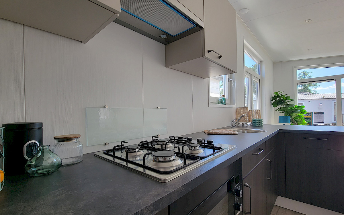 El Volente Deluxe ofrece todo lo necesario para una estancia confortable. El espacioso salón cuenta con suelo de vinilo, grandes puertas francesas y conexión para TV. La cocina en forma de L está totalmente equipada con amplio espacio de almacenamiento, placa de 4 fuegos, extractor de humos y frigorífico-congelador integrado. El dormitorio principal cuenta con una cama doble y un amplio armario con puertas correderas. El dormitorio de invitados/niños cuenta con dos camas individuales y prácticos armarios colgantes para mayor espacio de almacenamiento. El moderno baño cuenta con un elegante mueble de lavabo, un radiador de diseño, un inodoro y una amplia cabina de ducha con azulejos en las paredes. El chalet está equipado con revestimiento de plástico imitación madera, marcos de ventanas de plástico, doble acristalamiento y calefacción central: un equilibrio perfecto entre comodidad y durabilidad.