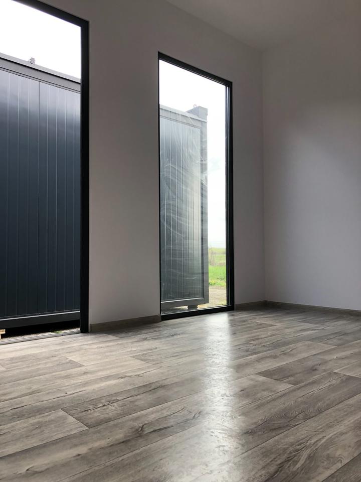 Acabado con tableros OSB (18 mm), piso de madera laminada y rodapiés de MDF blanco