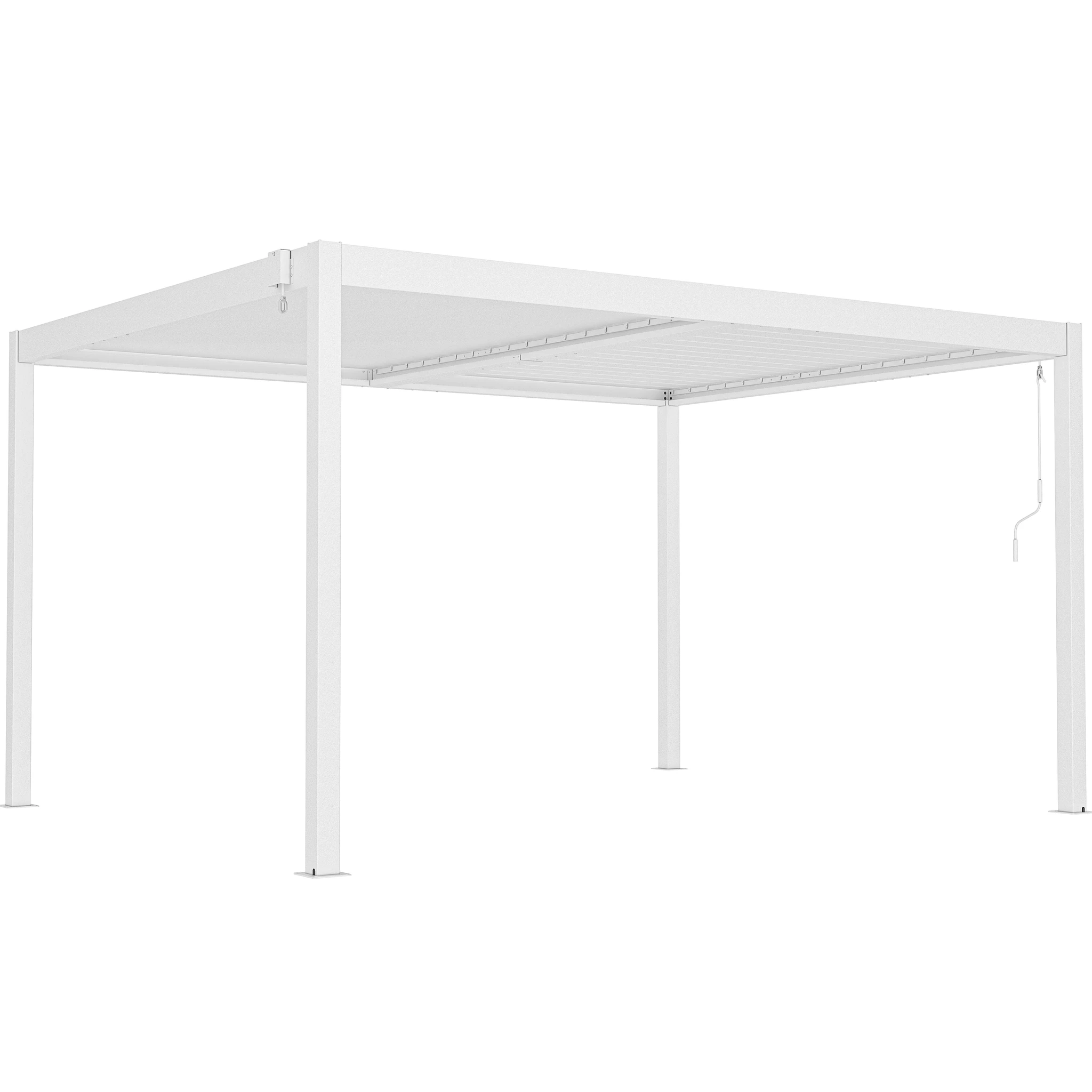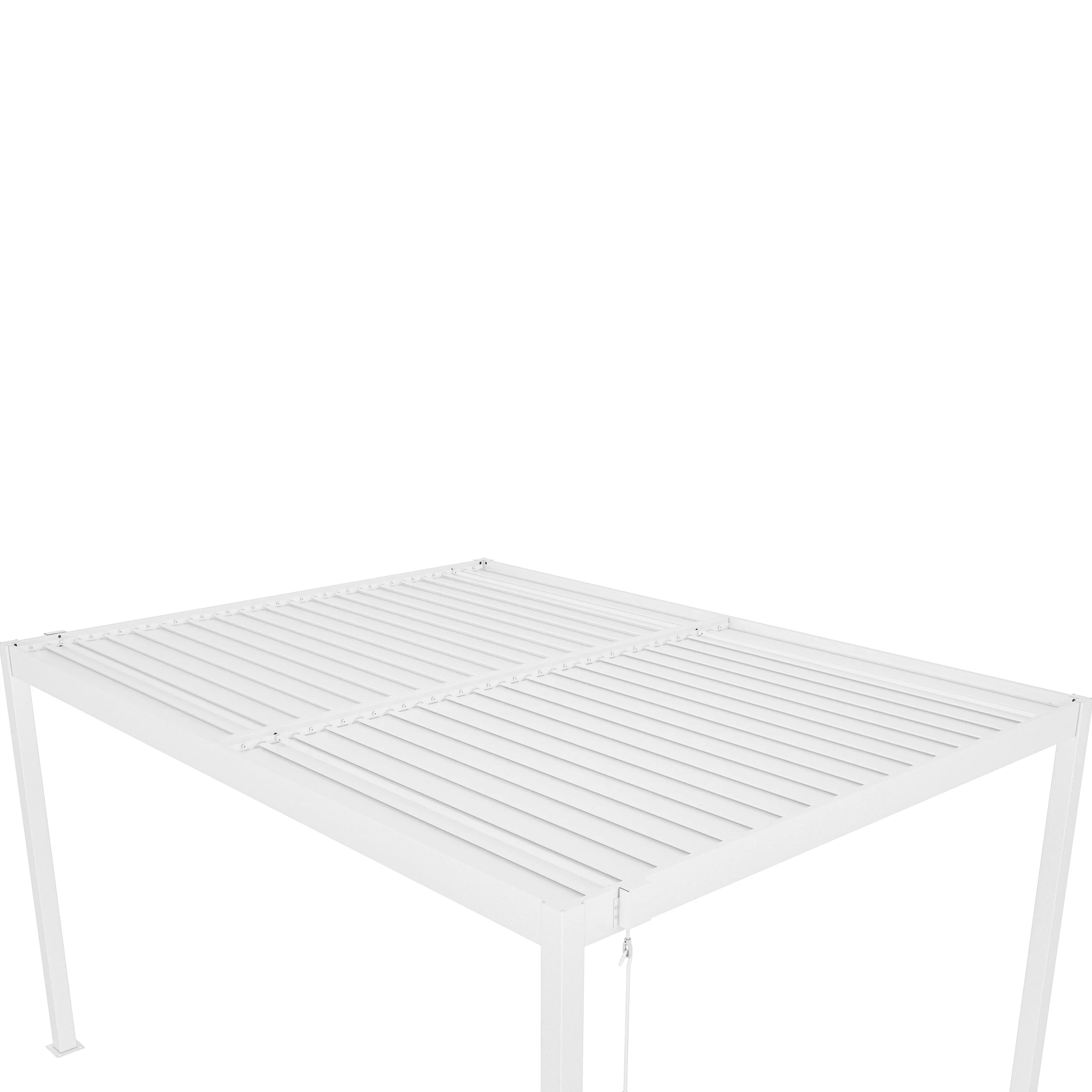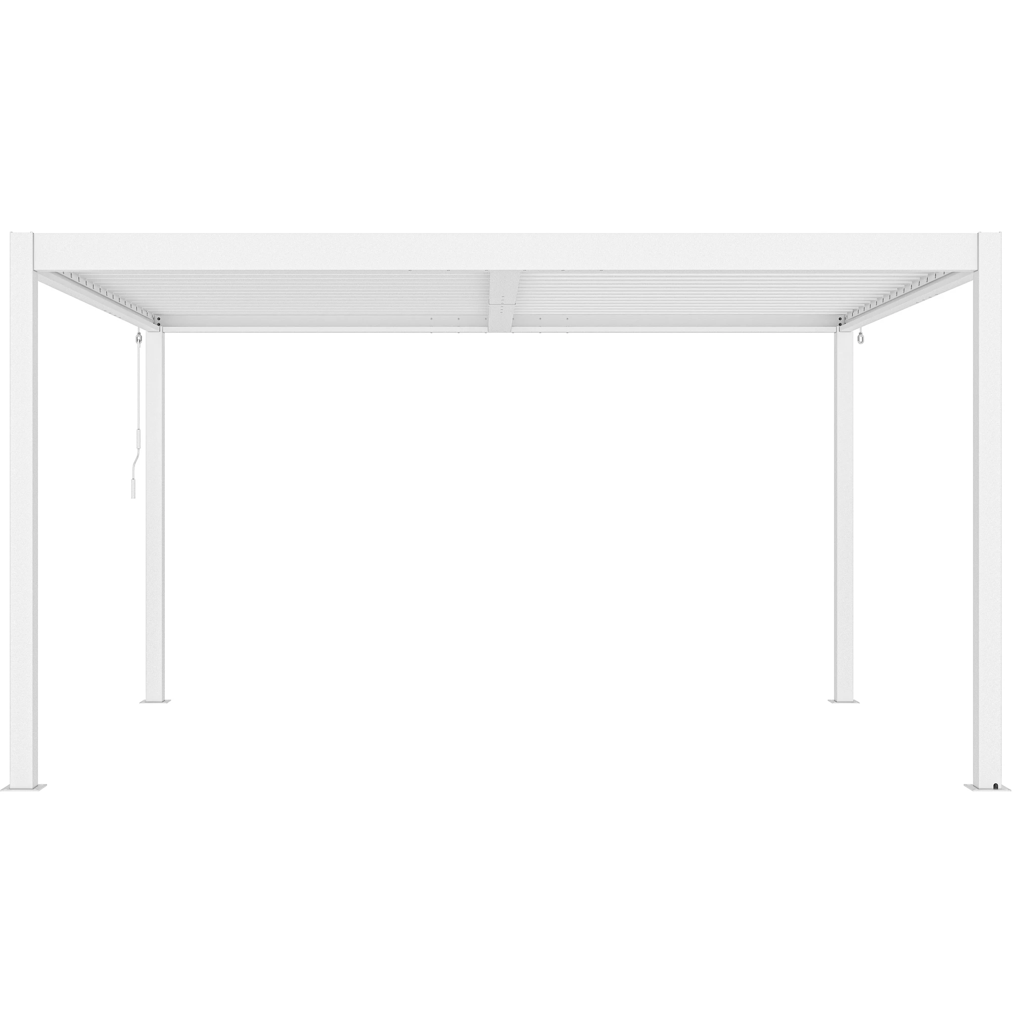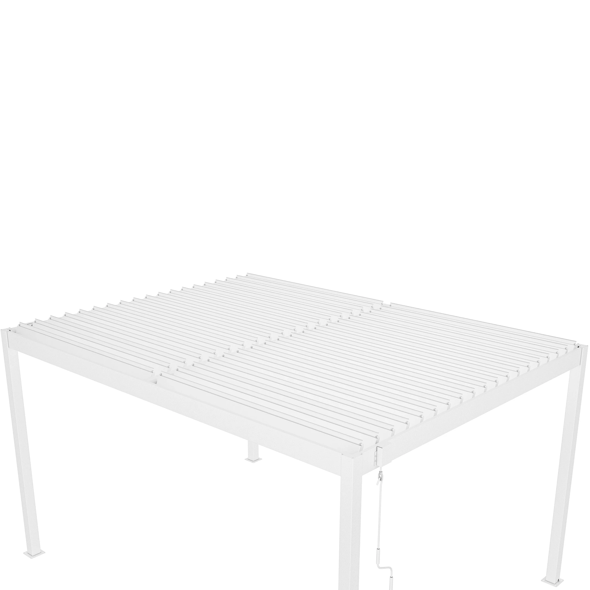 Una de sus principales funciones es su techo ajustable, que permite controlar la cantidad de sombra y ventilación. Las lamas pueden rotar de 0° a 110° mediante una manivela, brindándole flexibilidad para dejar entrar tanta o tan poca luz solar como desee. Esta pérgola está diseñada con un sistema de drenaje de flujo libre, por lo tanto, no pasará el agua cuando el techo esté cerrado (totalmente impermeable).