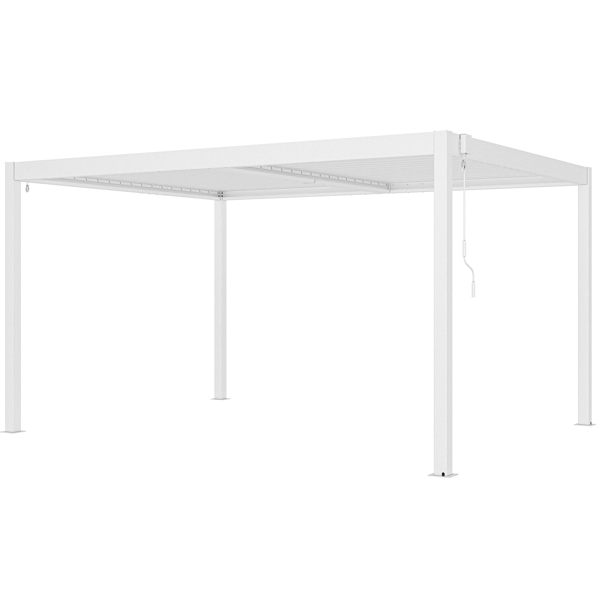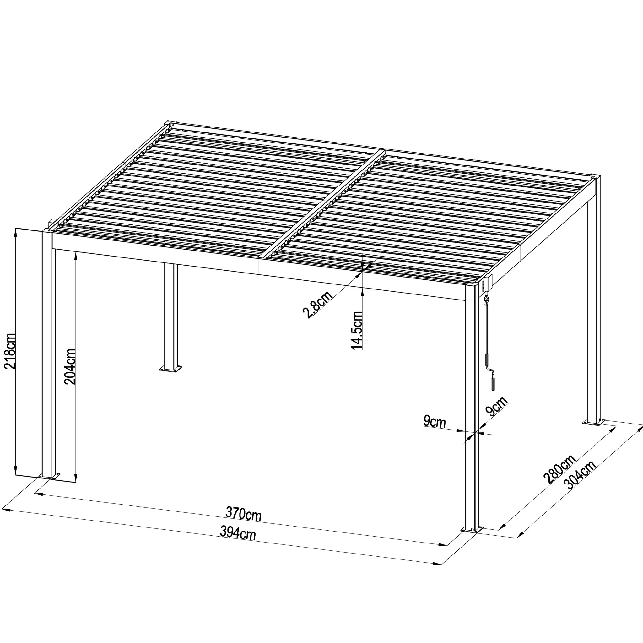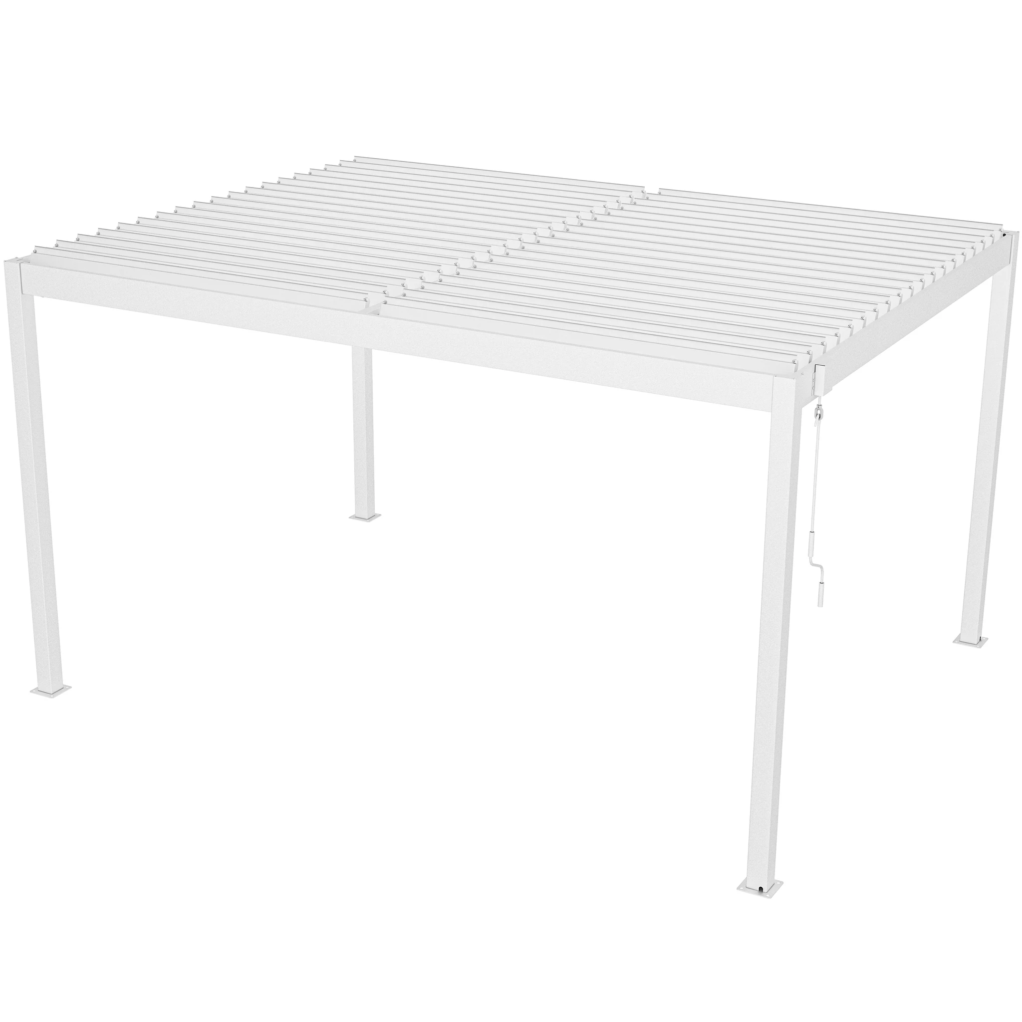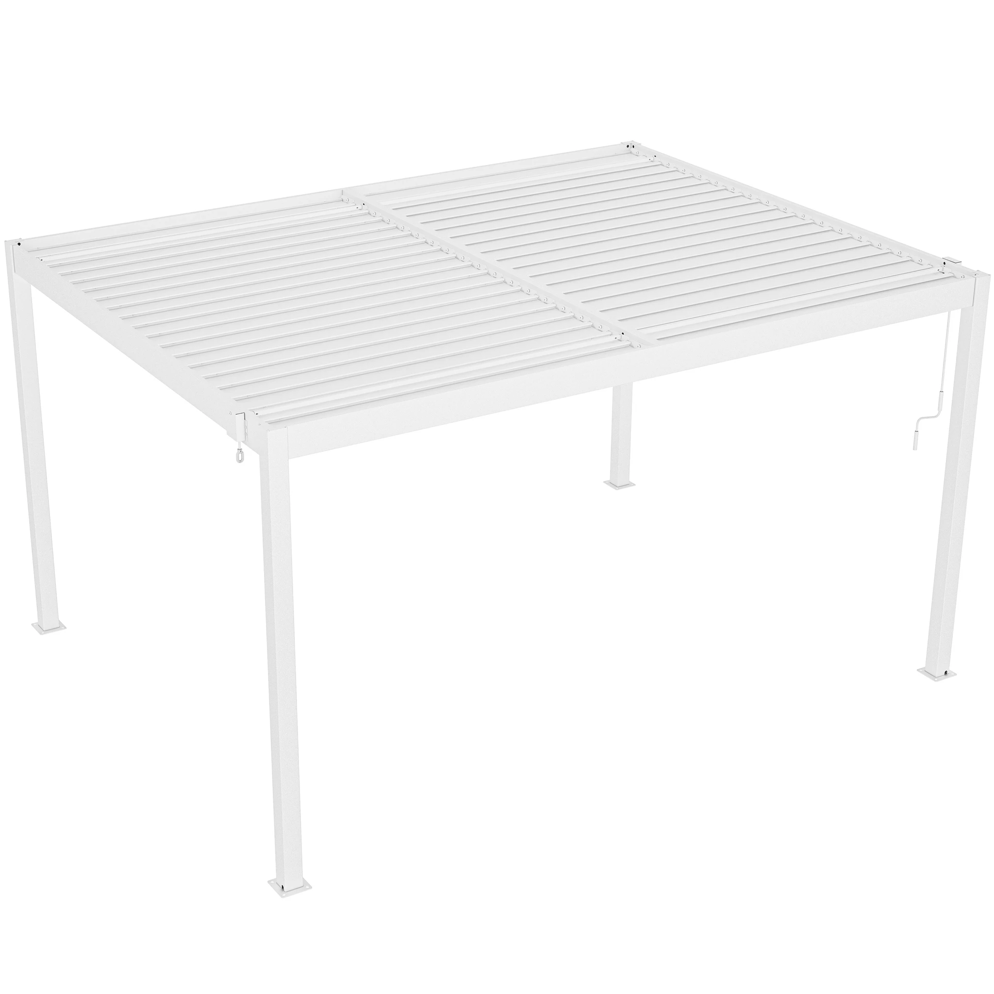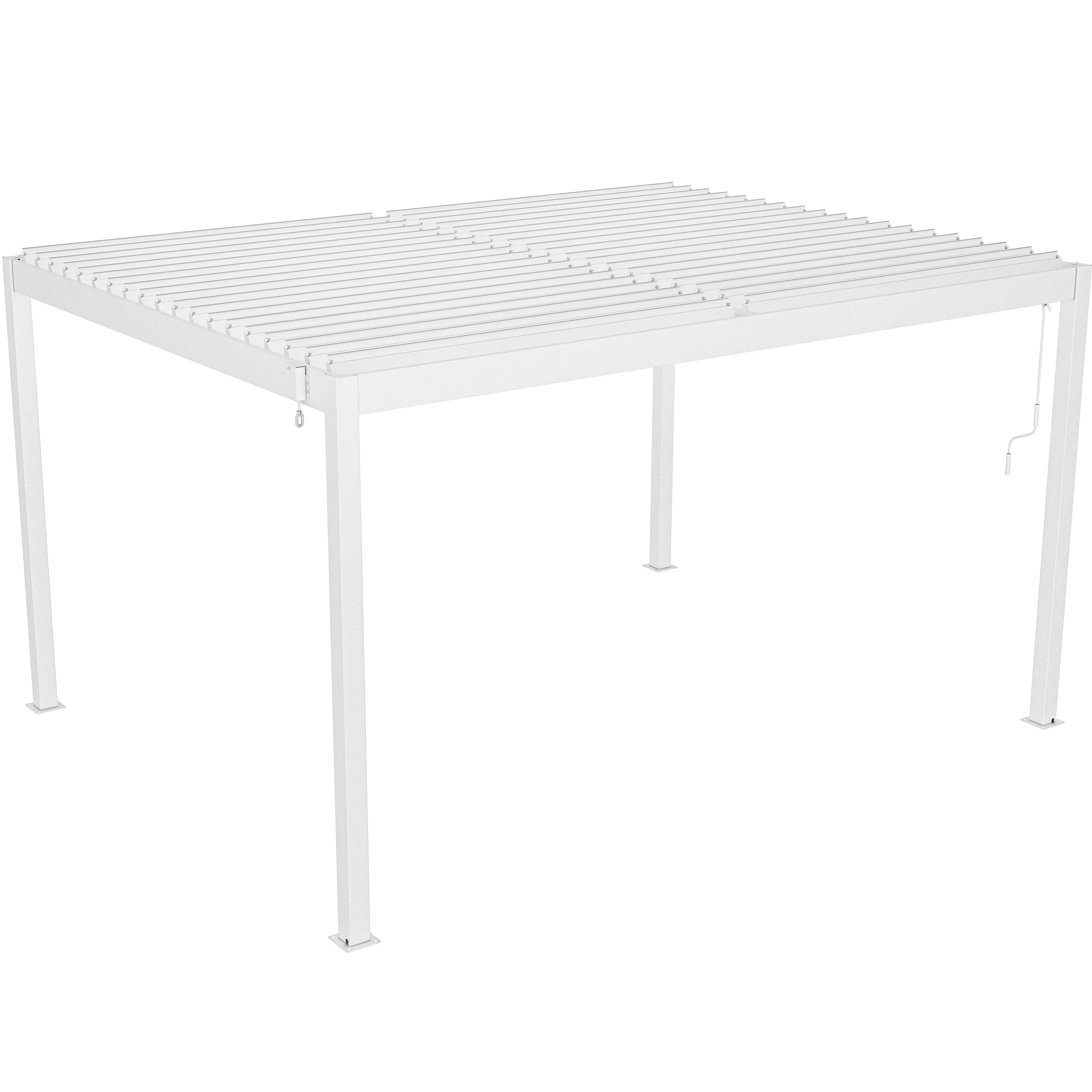 Una de sus principales funciones es su techo ajustable, que permite controlar la cantidad de sombra y ventilación. Las lamas pueden rotar de 0° a 110° mediante una manivela, brindándole flexibilidad para dejar entrar tanta o tan poca luz solar como desee. Esta pérgola está diseñada con un sistema de drenaje de flujo libre, por lo tanto, no pasará el agua cuando el techo esté cerrado (totalmente impermeable).